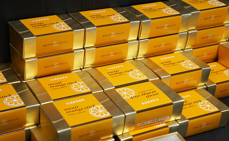 淡路島だけで育てられている「なるとオレンジ」の皮を砂糖漬けにして、一本一本手作業でベルギーチョコレートをコーティングしたお菓子。ほろ苦いオレンジの皮の風味と甘いチョコレートのコラボレーションが美味。